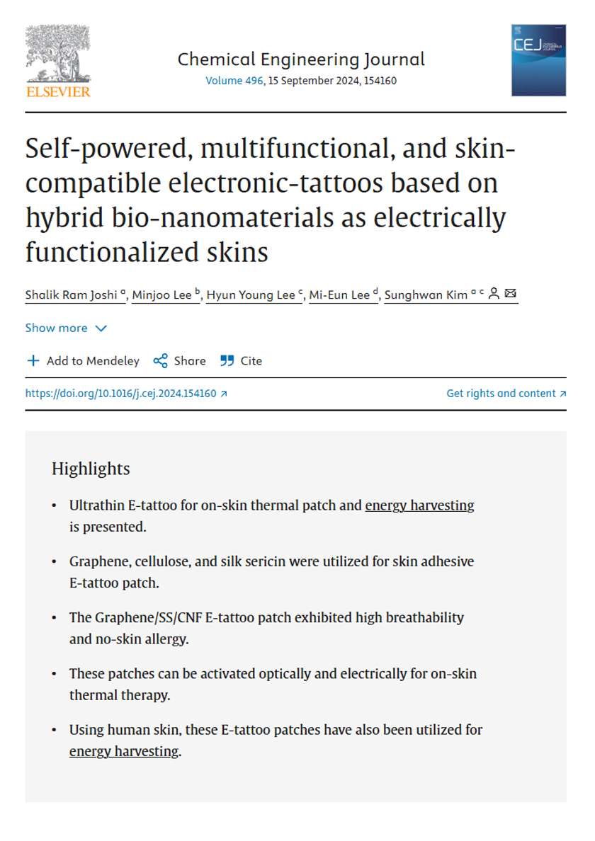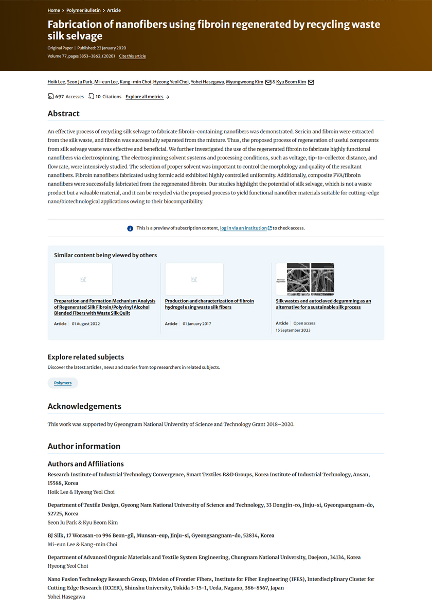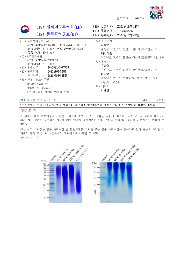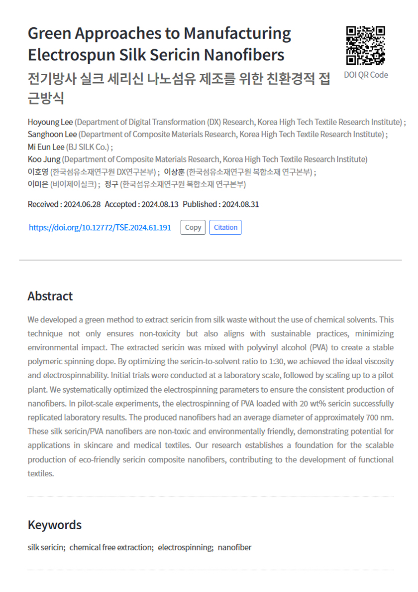 특허 (제 10-2427855 호) 저분자량 실크 세리신의 제조방법 및 이로부터 제조된 세리신을 포함하는 화장료 조성물 자세히 보기 + 논문 전기방사 세리신 나노섬유 제조를 위한 친환경적 접근방식 자세히 보기 + 논문 전기적으로 기능화한 피부로 작용하는 자가구동 방식의 다기능 피부호환형 전자문신 자세히 보기 + 논문 폐 실크 가장자리 재활용을 통해 재생한 피브로인을 사용한 나노섬유 제조 자세히 보기 +